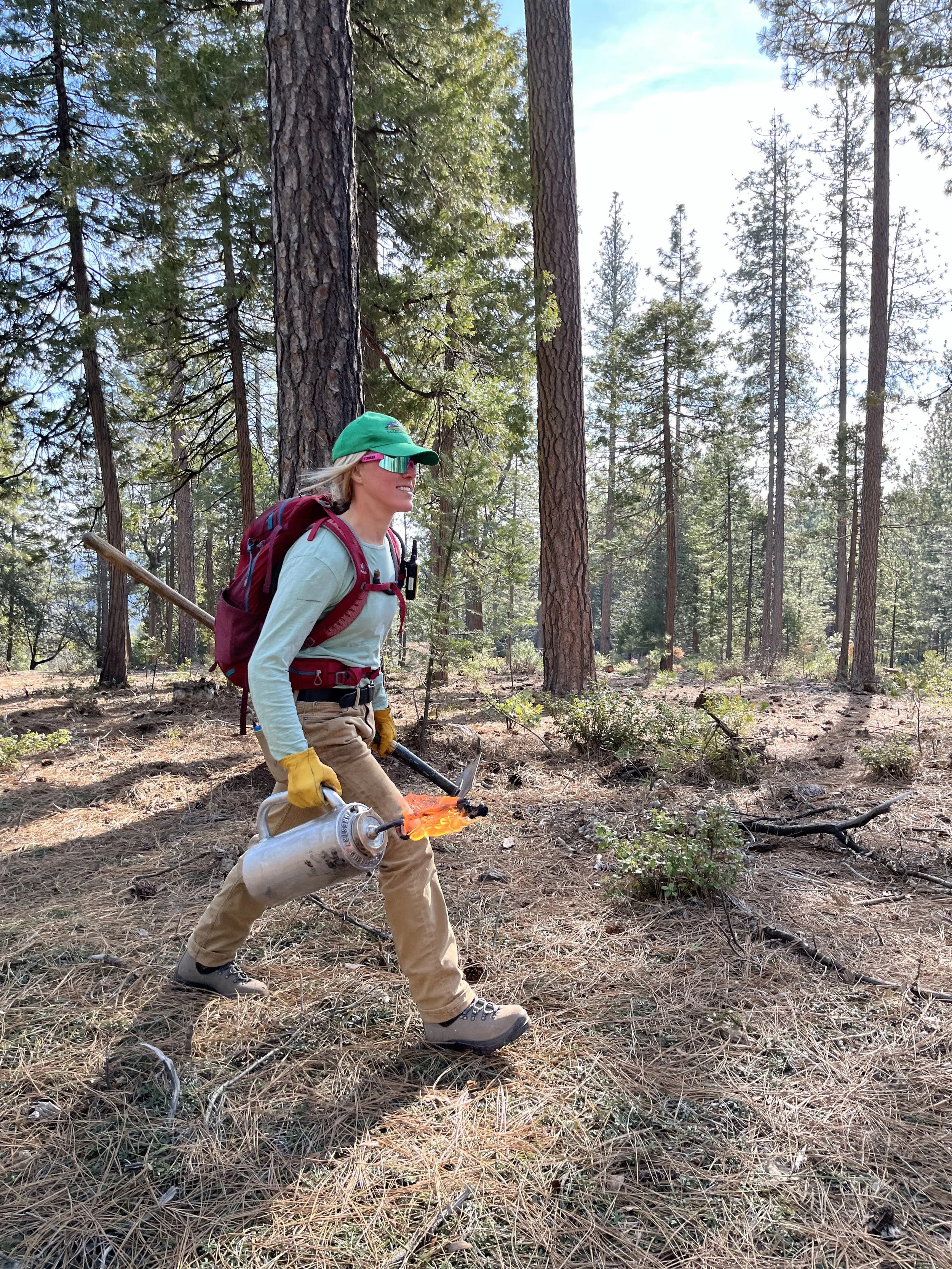“I held a pitchfork piled with burning pine needles. Tines low over the dry ground, I let flames spread to the duff below. Tongues of orange and gold licked out from the two-foot-high flaming front uphill from me. The smell of smoke was thick in the air, even with bandanas over our faces.”